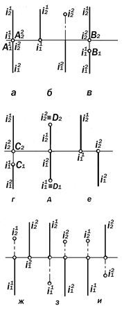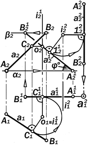 Рис.11.10. Графическая модель преобразования проекций отрезка АВ общего положення в его проекции проецирующего положення перболоид вращения, горловиной ко- торого являеться параллель, образо-ванная вращением точки С, удалённой от оси і на кратчайшее расстояние. Утверждение 11.10. Если отрезок АВ вращается вокруг оси і ^ П1 (П2), то он дважды проходит через положе-ние, параллельное той плоскости про-екций, по отношению к которой ось вращения параллельна. При этом вну-тренняя метрика вращающейся про-екции отрезка не изменяется, а вну-тренняя метрика проекции, точки ко-торой совершают возвратно-посту-пательные движения, метрически пре-образовываются от величины крат-чайшего расстояния между плоскос-тями вращения его концов А и В (при АВ || П3) до натуральной величины от-резка АВ (при АВ || П1 (П2)). Из двух последних утверждений следует ПРАВИЛО 3: Для того, чтобы графически определить длину отрез-ка АВ прямой общего положения и угол его наклона к П1 или к П2 по его отро-гональным проекциям, необходимо и достаточно расположить ось і ^ П1 или к П2, опустить из вырожденной в точку проекции і1 (і2 ) оси і перпендику-ляр О1С1 = | RC | на А1В1 или О2С2=| RC | на А2В2 и повернуть соответствую-щую проекцию О1С1 (О2С2 ) до положе-ния О1С11 (С21) или О2С 12 (С 22 ), совпа-дающего с вертикальной линией связи. Тогда А1В1 ^ О1О1 или А2В2 ^ О2С2зай - мут положения А11В11 или А12В12, па-раллельное оси проекций х12, а А2В2 (А1В1) преобразуются в проекции А12В12 или А11В11, содержащие необходимую метрическую информацию (рис.11.8). Утверждение 11.11. Вращая пря-мую линию общего положения вокруг той или иной проецирующей оси, её можно из общего положения перевес-ти только в положение линии уровня. Утверждение 11.12. Вращая пря-мую линию уровня вокруг проецирую-щей оси, её можно перевести в поло-жение, перпендикулярное к той плос-кости проекций, по отношению к ко-торой ось вращения параллельна.