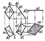 Алгоритмы решений: а) a ↷ a2 || П2 (рис.11.23); 1. a É f; f1 ^ A1 A2 Ù Î a1; f2 Î a2; 2. f2 ↷ f12 || A1A2; a2 ↷ a12; a1 ® a11 - прямая линия; 3. a11 ↷ a 21 ^ А1 А 2; a12 ® a22 =| a |. б) a ↷ a2 || П1 (рис.12.24) 1. a É h; h2 ^ A1A2 Ù Î a 2; h1 Î a1; 2. h1 ↷ h11 || A1A2; a1 ↷ (a11 @ a1); a 2 ® a12 - прямая линия; 3. a11 ↷ a21 ^ А1А2; a21 ® a22 = | a |. При помощи первой основной задачи на плоскость можно решать следующие конкретные метрические задачи: