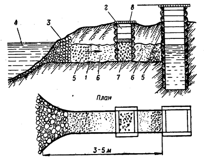 Для выявления источников воды и определения возможности их использования инженерными разведывательными дозорами проводится разведка на воду. В состав дозора при необходимости включаются специалисты медицинской службы. Задача разведки на воду состоит в том, чтобы установить тип, количество, местонахождение, а также санитарное состояние водоисточников и окружающей местности; определить пригодность воды для питьевых и других нужд; оценить техническое состояние источников, дебит и запас воды в них; возможность оборудования пунктов водоснабжения и подходов к ним. В качестве источников воды могут быть использованы: - открытые водоемы (реки, озера, пруды, водохранилища, моря); - источники подземной воды (скважины, колодцы, родники и т.д.); - атмосферные осадки (дождевая вода, снег, лед). Открытые водоемы часто загрязняются за счет бытовых и промышленных стоков, дождевых и талых вод. Поэтому всегда следует отдавать предпочтение источникам подземной воды, так как они защищены от поверхностных загрязнений вышележащими слоями грунта. Чем больше глубина залегания водоносного слоя, тем лучше в санитарном отношении вода. При использовании рек с бурным течением, мутной водой с 6ольшим количеством взвешенных частиц для забора воды на расстоянии 15—20 м от уреза воды устраивают фильтрационные колодцы. При водонепроницаемом грунте дна и берегов, через который фильтрация воды невозможна, для забора воды приходится устраивать колодцы с фильтрационными траншеями (рисунок 4.1). Вода, проходя через слой грунта или фильтрационную траншею, в значительной степени освобождается от цветности и взвешенных веществ, чем облегчаются ее дальнейшая очистка и обеззараживание. Кроме того, грунт и фильтрационный материал траншеи задерживают часть микроорганизмов, а также радиоактивных и отравляющих веществ.