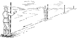 При измерении расстояний между точками земной поверхности их необходимо закрепить и обозначить (т. е. установить какие-то знаки) на местности. Простейший способ закрепления точки на местности сводится к тому, что вровень с землей забивают деревянный колышек длиной 30 см и толщиной 4 - 6 см. Точкой является центр торца колышка (иногда в центр забивают гвоздь, шляпка которого обозначает точку). Для отыскания закрепленной точки на местности рядом с колышком забивают другой, который выступает над землей на 15 - 20 см. Этот колышек называется сторожком (рис. 1, а). На сторожке пишется номер точки. Оба колышка окапывают вокруг канавой. Указанным способом закрепляют точки, не требующие длительного сохранения. Точки, которые необходимо сохранять в течение длительного времени, закрепляют более прочно, например, при помощи деревянного столба или металлического рельса с крестовиной (якорем) в нижней части (рис. 1, в). На деревянном столбе точка обозначается с помощью гвоздя, забитого в вырезе верхней части столба; на металлическом - с помощью насечки в виде креста в верхней части. Если точка нужна для вспомогательных построений или для однократного использования, то для ее обозначения пользуются вехой - шестом длиной 2 - 3 м с металлическим наконечником и определенной раскраской (рис. 1, г). Измерить линию на местности - значит сравнить ее длину с длиной мерной ленты или рулетки. Процесс измерения длины линии заключается в последовательном откладывании мерного прибора по этой линии. Вертикальная плоскость, проходящая через конечные точки линии, называется ее створом. Подготовка линии на местности к измерению состоит в разделении ее на лежащие в створе отрезки, которые по длине равны или меньше длины мерного прибора. Чтобы провешить линию (рис. 2) на глаз, наблюдатель становится в нескольких метрах от вехи, поставленной в начальной точке. Помощник наблюдателя, двигаясь от конечной точки к начальной точке, останавливается в промежуточной точке и, перемещаясь вправо или влево по команде наблюдателя ставит веху так, чтобы она находилась на одной линии, т. е. в створе, с вехами, установленными в начальной и конечной точках. Далее, таким же образом, устанавливается веха в следующей промежуточной точке, и так далее. Такое вешение называется «на себя», оно является более удобным и более точным, чем вешение «от себя». Количество промежуточных вех будет зависеть от длины линии и условий видимости.