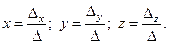 Определитель D называется определителем системы (1). Определители Dx, Dy, Dz получаются из определителя D заменой свободными членами элементов соответственно первого, второго и третьего столбцов. Возможны следующие случаи. Случай 1 (D¹ 0). В этом случае существует единственное решение системы, и оно может быть найдено по следующим формулам, которые называются формулами Крамера.