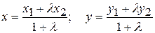 Пусть на плоскости дан произвольный отрезок М1М2 и пусть М – любая точка этого отрезка, отличная от точки М2 (рис.1). Координаты точки М(х; у) делящей отрезок между точками М1(х1; у1) и М2(х2; у2) в заданном отношении λ, определяются по формулам: