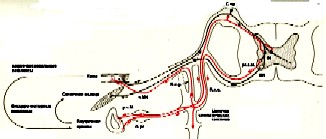 Рис.3. Кожно-висцеральные и висцеро-моторные рефлексы спинного мозга. (G.pr.- предпозвоночный ганглий, G.sp.- спинномозговой ганглий, R.c.a.- белая соединительная ветвь, R.c.g.- серая соединительная ветвь, pr.s.N.- преганглионарный симпатический нейрон, p.s.N.- постганглионарный нейрон, IN - интернейрон, M.N. - скелетно-моторный мотонейрон, s.N. - симпатический мотонейрон).