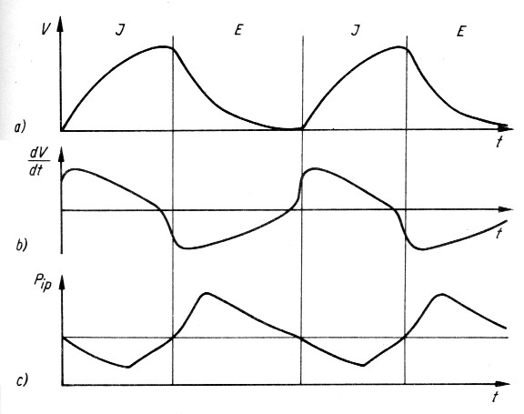Рис.11. Спирограмма (а), пневмотахограмма (b) и внутрилегочное давление (с)в двух дыхательных циклах (I - вдох, Е - выдох)