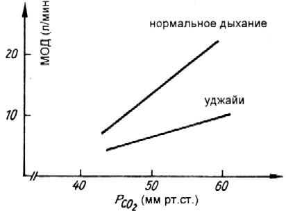 Какую роль, таким образом, могут играть различные пранаямы в системе регуляции внешнего дыхания? Прежде всего, надо уяснить себе в принципе, что произвольные манипуляции формой дыхания с целью получить определенные изменения минутных объемов дыхания все же не составляют непосредственной цели пранаямы. Что касается глубины и частоты дыхания, то они находятся в обратных соотношениях: быстрые пранаямы выполняются с относительно меньшим объемом вдоха, чем медленные, а там, где на первом плане стоит глубина дыхания, падает его частота («великое дыхание», уджайи, мурча). При всех пранаямах с углубленным вдохом (по аналогии с процессами в скелетной моторике при асанах) до предела своих функциональных возможностей должны быть задействованы проприорецепторы, что ведет к аналогичным эффектам, а именно к усилению афферентации с увеличением специфической и неспецифической репрезентации в ЦНС (см.3.6). В условиях покоя это означает также «сознательное» противодействие рефлексу Геринга-Брейера. Во всех случаях экстремально замедленного дыхания (кумбхака, уджайи, мурча, бхрамари, кевали, а также ритмическое дыхание) следовало бы ожидать гипоксию и гиперкапнию, но, к сожалению, до сих пор не проводилось соответствующих измерений парциальных давлений газов крови. Медленные пранаямы зачастую выполняются очень долго, в экспериментах по самопогребению до 9 часов (см.5.3.2). Такие практики, по-видимому, ведут также и к адаптивным процессам химической регуляции дыхания. При исполнении и вследствие уджайи меняется крутизна характеристических кривых регуляции дыхания по CO2 (Stanescu и др. 1981), что равным образом означает снижение активности системы химической регуляции дыхания, а стало быть, в перспективе становление нечувствительности регулятора. На рис.24 показано различие средних кривых регуляции дыхания по CO2 для восьми испытуемых с многолетним опытом хатха-йоги (асаны, уджайи и кумбхака) и кривых регуляции по CO2 восьми членов контрольной группы. При дыхательном тестировании в замкнутом объеме было обнаружено при сравнении спонтанного дыхания и уджайи (рис.25), что ответная зависимость дыхания от напряжения CO2 при уджайи понижается.