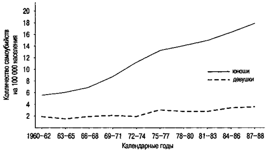 Рис. 1.12. Количество самоубийств среди 15-19-летних в зависимости от пола (по Г. Крайг, 2000)