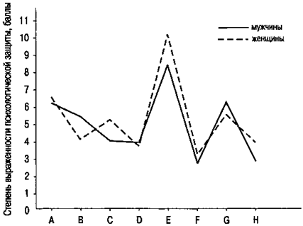 (A — отрицание; B — вытеснение; C — регрессия; D — компенсация; E — проекция; F — замещение; G — интеллектуализация; H — реактивное образование) Рис. 8.1. Профиль доминирующих механизмов психологической защиты у мужчин и женщин