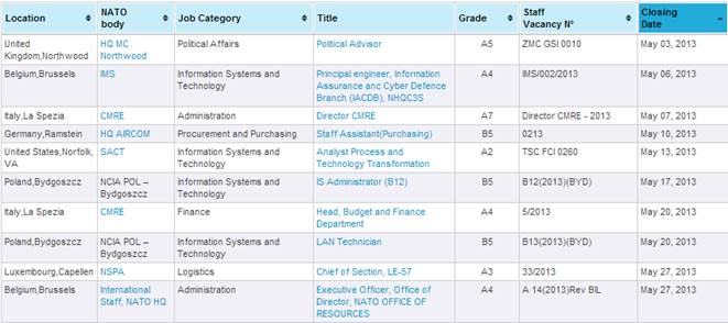 Рис.3 Вакансії Стаття «Можливості для бізнесу» містить у собі інформацію про всі закупівлі та фінансові операції, які проводило НАТО за певний проміжок часу(відповідно до заданого). Стаття «Історія» включає в себе велику кількість інформації про історію самої організації, а також про цікаві події і факти, які стосують НАТО. Стаття «FAQ» містить у собі питання(та відповіді на них), які частіше за все цікавляти відвідувачів сайту та містить інформацію про зворотній зв’язок з представниками самої організації. В даній темі розміщенні питання, яке стосують безпосередньо самої організації, її діяльності, а також інформація про сайт НАТО(коротка інформація для користувача). Другий розділ називається «НАТО від А до Я». Він містить у собі публікації трактування подій, з точки зору організації. Розділ обладнаний алфавітним покажчиком для швидкої навігації.