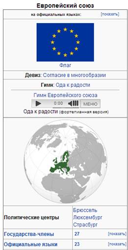 Рис.11Розділ FAQ В підрозділі «Про НАТО» даються відповіді на питання: · Чим займається НАТО? · Чи має НАТО власні збройні сили? · Які умови входу в НАТО? · Які позиції НАТО стосовно Іраку? · Яка роль НАТО в боротьбі з тероризмом? · Втручання НАТО в Афганістан · Статус Росії, чи є вона країною-партнером? · Офіційні мови в НАТО · Як багато НАТО коштує, і хто платить за це? · Рекомендована література Підрозділ «Робота на НАТО»: · Як я можу влаштуватись на роботу на НАТО? · Як подати заявку на стажування в НАТО? · Чи є НАТО спонсором проектів дослідження? Підрозділ про сайт НАТО: · Базова по сайту НАТО · Специфічні матеріали · Питання про розміщення сторонніх посилань(реклами) на сайті? · Питання про підписку на оновлення 2) Переходимо по посиланню https://ru.wikipedia.org/wiki/Европейский_союз На головній сторінці можна ознайомитись з визначенням ЄС, дією законів, які функціонують в країнах-членах Європейського союзу та регулюють його діяльність. Також можна ознайомитись з короткою історією ЄС та з переліком організацій, які співпрацюють з ЄС в рамках своє діяльності. 2а)Ознайомлюємось з розділом загальна інформація, яка представлена у вигляді таблиці.