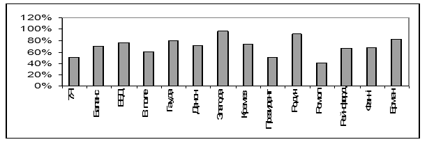 Рис.Д6.4. Збалансованість асортименту за видами кисломолочних продуктів Джерело: [323] Проведені дослідження дозволили зробити висновок про те, що асортиментна політика повинна посідати важливе місце в роботі підприємств, оскільки збалансований асортимент є одним з головних чинників успішної роботи. Асортимент має бути представлений великою кількістю різноманітної продукції, адже на нього звертають увагу 60-90% покупців, вважаючи це гарантією того, що буде зроблений правильний вибір [323]. Дослідження ринку риби та рибної продукції м. Херсона виявило, що ставлення споживачів до риби і рибної продукції визначається багатьма чинниками, але дохід на одного члена родини виявився одним з головних. Більшість респондентів, з доходом меншим 300 грн. на одного члена родини (24%), відповіли, що риба для них має дуже важливе значення. Майже половина респондентів з доходом до 500 грн. відповіли, що риба як продукт харчування для них має важливе значення (48% та 46%, відповідно). Не має особливого значення має риба для 55 % опитаних, чий дохід складає від 801 до 1000 грн. Майже половина респондентів з доходом понад 2000 грн. вважають, що риба в їх харчуванні не має важливого значення. Загалом 85% родин херсонців витрачають на рибу до 10% бюджету. Від 16% до 25% родинного бюджету витрачає 6% родин. Сімей, здатних витратити 30% бюджету на рибу та рибну продукцію, лише 1%. Перевагу прісноводній рибі надають 59% опитаних, а решта – морській. Визначимо основні фактори, що впливають на купівлю риби та рибної продукції. Серед них можна виокремити наступні: низька ціна стосовно м’яса та м’ясопродуктів, високі смакові властивості, корисність та дієтичні властивості риби (табл.Д6.2). Так, на перше місце зазвичай ставлять порівняно низьку ціну (34%), на друге – неспроможність купувати м’ясну продукцію (21%). Фактор великої кількості місць реалізації обіймає останнє – шосте місце серед усіх факторів, що можуть вплинути на вибір рибної продукції (2, 5%). Структура споживчих переваг щодо рибної продукції наведена в табл.Д6.3.