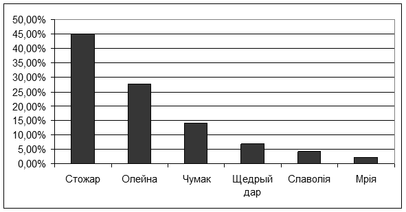 Рис.Д6.12. Місце купівлі рослинної олії Джерело: дослідження автора Аналіз анкет показав, що рекламою, яка найбільше запам’яталась споживачам, є реклама олії «Стожар» (45%). На другому місці – ТМ «Олейна» (28%). Свого часу «Олейна» провела масивну рекламну компанію і тепер реклама цієї соняшникової олії лунає рідше, лише як нагадування для споживачів. На третьому місці – ТМ «Чумак» (14%). Ця торгівельна марка є головним конкурентом «Олейни» на вітчизняному ринку. З четвертого по шосте місце надалі відповідно розташувалися: «Щедрий дар» (7%), «Славолія» (4%), «Мрія» (2%) (рис.Д6.13).