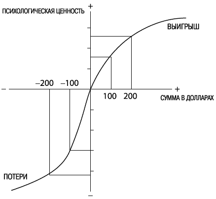 Эти три принципа, управляющие ценностью исходов, проиллюстрированы на рисунке 10. Если бы у теории перспектив был флаг, на нем должен быть изображен этот рисунок. График показывает психологическую ценность выигрышей и потерь, которые являются «носителями» ценности в теории перспектив (в отличие от модели Бернулли, где носителями ценности являются размеры богатства). График четко делится на две части – справа и слева от точки отсчета. Бросается в гла за S-образная форма, демонстрирующая снижение чувствительности как для выигрыша, так и для потерь. Наконец, две половинки S несимметричны. Кривая функции резко меняется в точке отсчета: реакция на потери сильнее, чем реакция на соответствующие выигрыши. Это – неприятие потерь.