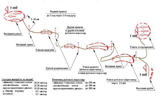 Райони та рубежі, що призначаються під час здійснення маршу. (показати схемою, вказати тактичні нормативи).