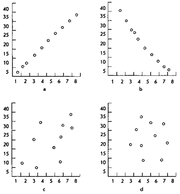 Рис. 2-2. Каждая из диаграмм иллюстрирует различную степень зависимости значений двух переменных. Каждая точка па диаграмме представляет собой показатели испытуемого по двум переменным: a — полная положительная корреляция (r = +1); b — полная отрицательная корреляция (r = -1); с — умеренная положительная корреляция (r = +0, 71); d — корреляция отсутствует (r = 0).