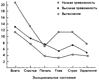 Рис. 3-3. Количество воспроизведенной информации у испытуемых с высокой и низкой тревожностью, а также у использующих вытеснение. (Источник: Davis and Schwartz, 1987, p. 158.)