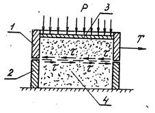 Рис. 10. Схема сдвигового прибора: 1 – верхнее подвижное кольцо; 2 – нижнее подвижное кольцо; 3 – стальная пластина; 4 – сыпучая порода; Р – уплотняющая сила; Т – сдвигающее усиление; τ – удельное сопротивление сдвигу