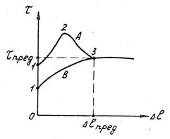 Рис. 11. Зависимости сопротивления сдвига от величины смещения: А – плотная порода; Б – рыхлая порода