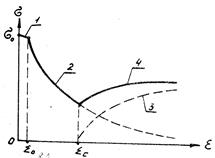 Рис.43.Давление на контуре выработки теряющей устойчивость: 1 – давление упругого (без разрушения) расширения породы в выработку; 2 – давление при расслоении породы; 3 – давление отвеса разрушенной породы; σ 0 – напряжение в нетронутом массиве; ε 0 – смещение от упругого расширения породы; ε c – смещение с отрывом породы от массива (образование свода разрушенной породы); 4 – суммарное давление