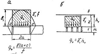Рис.59. Работа крепи в режиме заданной нагрузки: а – вес пород в контуре свода естественного равновесия; б – вес отслоившихся пород непосредственной кровли; 1 – полезное ископаемое; 2 – непосредственная кровля; 3 – основная кровля