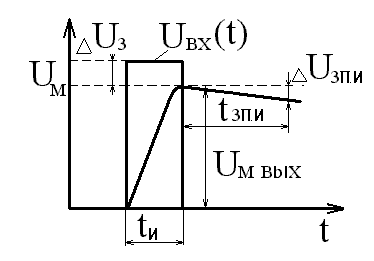 Рисунок 10 Преобразователь амплитуды (П, рис. 10, б) запоминает (расширяет) сигнал на уровне, близком к его пиковому значению UM. Накопительный конденсатор преобразователя быстро заряжается через прямое сопротивление диода во время действия на входе импульса. После окончания действия импульса диод запирается и накопительный конденсатор медленно разряжается на измерительный прибор (ИП, рис. 10, б) с большим входным сопротивлением (постоянная времени разряда много больше постоянной времени заряда). Входное сопротивление прибора должно быть велико, поэтому используют измеритель постоянного напряжения с высокоомным входом – электростатический вольтметр (1014 Ом и выше), ламповый электрометр и др. Временные диаграммы, поясняющие принцип работы, показаны на рис. 10, в, где uвх(t) и uвых(t) – напряжения исследуемого импульса соответственно на входе и на выходе преобразователя; tи – длительность исследуемого импульса; tзп.и – время запоминания импульса; Δ Uзп.и – абсолютная погрешность запоминания импульса; Δ Uз – абсолютная погрешность из-за недозаряда; Uм.вых – максимальное напряжение на выходе преобразования после окончания импульса. К основным характеристикам преобразования относят: относительную погрешность при заряде, равную Δ Uз/Uм; относительную погрешность запоминания, равную Δ Uзп.и/ Uм.вых; минимальную длительность преобразуемого импульса; время запоминания tзп.и, в течение которого погрешность запоминания не превосходит заданную; коэффициент расширения tзп.и/tи.мин. Погрешность преобразования определяется непостоянством коэффициента амплитудно-временного преобразования и интервала преобразования, амплитудной погрешностью параметров преобразуемого сигнала и т.д.