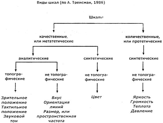 Протетические шкалы - униполярные шкалы интенсивности, увеличивающиеся от нуля (абсолютного порога) с сохранением одного и того же качества. Метатетические - это 1) оппозиционные, для которых описаны переходы от максимальной выраженности одного качества через нейтральное качество к максимуму противоположного качества; 2) транзитивные, содержащие различные значения, не организованные в оппозиции. Эриксон разделил метатетические шкалы на кодируемые топографически, т. е. с пространственной репрезентацией, и без нее - не топографические измерения.