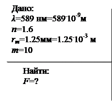 Фокусное расстояние линзы определяется радиусами кривизны её поверхностей и показателем преломления: Радиус m -го темного кольца Ньютона в отраженном свете Ответ: F= 0.44 м.