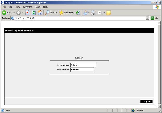 1. Для обновления программного обеспечения для ADSL-модема запустите Ваш Web-браузер (например, «Internet Explorer»), введите в строке адреса https://192.168.1.1 и нажмите клавишу Enter. На открывшейся странице в полях «Username:» и «Password:» введите соответственно «Admin» и «Admin» (с большой буквы без кавычек) и нажмите кнопку «Log In»: