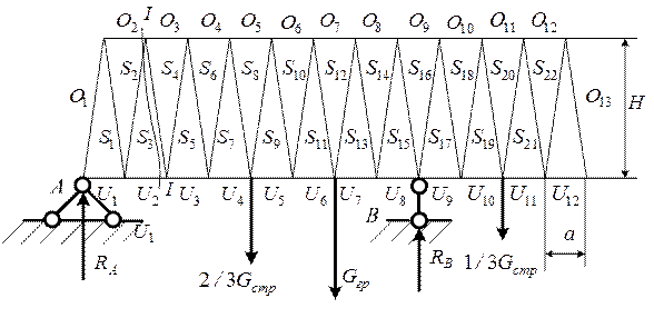 На рис. 2.1. дана общая схема фермы. Размеры ферм и действующие нагрузки приведены в табл.2.1, а в приложении приведены данные соответствующего варианта.