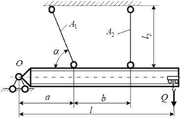 На рис. 3.1 представлена расчетная схема неповоротной кран-балки двутаврового сечения, двух подвесов, шарнирно соединенных с балкой. Показано наиболее нагруженное положение тельфером. Расчетная схема представляет стержневую систему один раз статически неопределимую. При раскрытии статической неопределимости необходимо дополнительно, кроме уравнения статики, записать уравнение совместности деформаций.