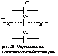 При параллельном соединении конденсаторов разность потенциалов на обкладках всех конденсаторов одинакова и равна (φ A – φ B). Общий заряд конденсаторов равен