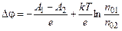 где е – заряд электрона. Итальянский физик А.Вольта опытным путем установил, что при соприкосновении двух различных металлов между ними возникнет контактная разность потенциалов (рис.35). Первый закон Вольты: контактная разность потенциалов зависит только от химического состава и температуры соприкасающихся металлов: Δ φ 12 = φ 1 – φ 2= где n 01 и n 02 – концентрация электронов в проводниках, A 1 и A 2 – работы выхода электронов из первого и второго металлов, k – постоянная Больцмана, T – абсолютная температура.