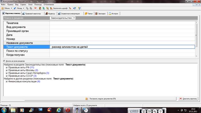 Для поиска документов обычно заполняют несколько полей, т.е. пункты 1 – 5 повторяют несколько раз. 6. Узнайте, сколько документов соответствует поставленным условиям в нижней строке карточки реквизитов. 7. Откройте список документов, соответствующих всем поставленным условиям клавишей «F9» или щелчком по кнопке «Построить список».