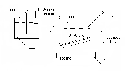 1-мешалка УРП-2М; 2-насос для перекачки флокулянта; 3-расходный бак; 4-насос-дозатор; 5-воздуходувка Рис.5 Схема хранения флокулянта