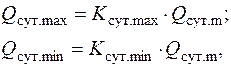 где p – плотность населения, чел/га; F – площадь района с данной степенью благоустройства, га; kн.н. – коэффициент увеличения расхода воды за счет неучтенных нужд (1, 1…1, 2). Расчетные расходы в сутки наибольшего и наименьшего водопотребления определяют: