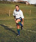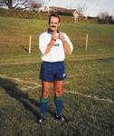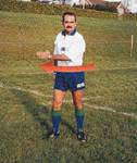 1. Штрафной удар. Плечи параллельны боковой линии. Рука втянута под углом к горизонтали в направлении невиновной команды.
