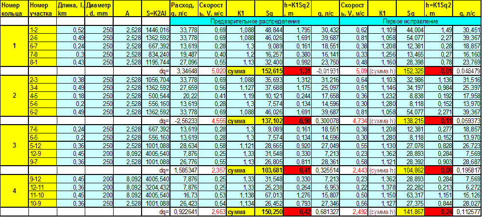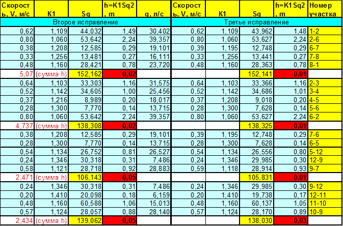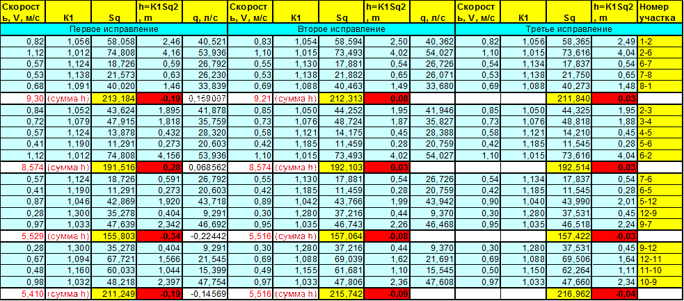 Для кольцевых сетей необходимо выполнение второго закона Кирхгофа, т. е. сумма потерь напора должна быть равна нулю. Так как второй закон Кирхгофа не выполняется, то по формуле Андрияшева определяем поправку: