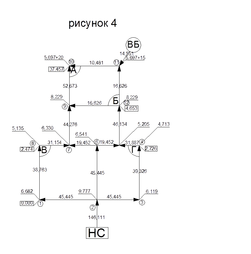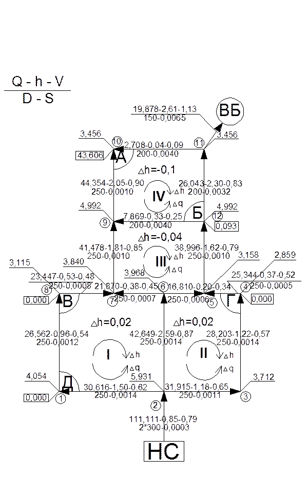 Далее строим схему окончательного распределения потока воды по участкам сети (см. рис.3.) Пояснение к рисунку: