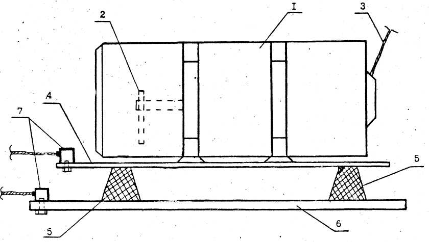 Рис.2. Лабораторная установка ддя измерения уровней виброскорости; I - электропривод; 2 - груз; 3 - кабель; 4 - площадка; 5 - амортизаторы; 6 - основание; 7 - вибродатчики