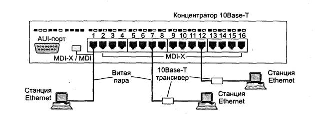 Мал. Концентратор Ethernet Для з'єднання концентраторів технології 10Base-T між собою в ієрархічну систему коаксіальний або оптоволоконний кабель не обов'язковий, можна застосовувати ті ж порти, що і для підключення кінцевих станцій, з урахуванням однієї обставини. Річ у тому, що звичний порт RJ-45, призначений для підключення мережного адаптера і званий MDI-X (кросованний MDI), має інвертовану розводку контактів роз'єму, щоб мережний адаптер можна було підключити до концентратора за допомогою стандартного сполучного кабеля, не кросуючого контакти. У разі з'єднання концентраторів через стандартний порт MDI-X доводиться використовувати нестандартний кабель з перехресним з'єднанням пар. Тому деякі виробники забезпечують концентратор виділеним портом MDI, в якому немає кросування пар. Таким чином, два концентратори можна з'єднати звичним некросированним кабелем, якщо це робити через порт MDI-X одного концентратора і порт MDI другого. Частіше один і той же порт концентратора може працювати і як порт MDI-X, і як порт MDI, залежно від положення кнопкового перемикача, як це показано в нижній частині мал. Багатопортовий повторювач - концентратор Ethernet може по-різному розглядатися при використовуванні правила 4 хабів. У більшості моделей всі порти пов'язані з єдиним блоком повторення, і при проходженні сигналу між двома портами повторювача блок повторення вносить затримку всього один раз. Тому такий концентратор потрібно вважати одним повторювачем з обмеженнями, що накладаються правилом 4 хабів. Але існують і інші моделі повторювачів, в яких на декілька портів є свій блок повторення. У такому разі кожен блок повторення потрібно вважати окремим повторювачем і враховувати його окремо в правилі 4 хабів. Деякі відмінності можуть мати місце в моделях концентраторів, що працюють на одномодовий волоконно-оптичний кабель. Дальність сегменту кабеля, підтримуваного концентратором FDDI, на такому кабелі може значно відрізнятися залежно від потужності лазерного випромінювача — від 10 до 40 км. Проте якщо існуючі відмінності при виконанні основної функції концентраторов не такі великі, то їх набагато перевершує розкид в можливостях реалізації концентраторами додаткових функцій.