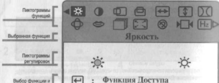 Більшість регулювань монітора виконуються через OSD, які описані в наступному розділі. Доступ до регулювань контрастності і яскравості може виконуватися безпосередньо з передньої панелі монітора. 1. Коли на екрані немає меню, натисніть кнопку 2. Для збільшення величини регульованого параметра натисніть кнопку 3. Для виходу з OSD натисніть кнопку Система екранних меню (OSD) Монітор має систему OSD, доступ до яких здійснюється за допомогою кнопок, розташованих на передній панелі монітора, і які дозволяють відрегулювати параметри відтвореного на екрані зображення. Зміна параметрів зображення вказується за допомогою відповідних піктограм регулювань. Деякі функції мають підменю. 1. Натисніть кнопку 2. Для переходу з однієї піктограми на іншу натисніть кнопку 3. Для вибору функції або відкривання підменю натисніть кнопку 4. Для виконання регулювання використайте кнопку 5. Для виходу з меню й збереження виконаних змін натисніть кнопку
