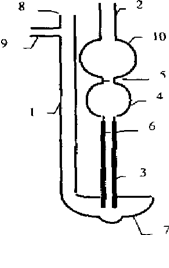 1.3. Описание установки и порядок выполнения эксперимента Установка для проведения эксперимента включает вискозиметр капиллярный стеклянный типа ВПЖ-2, водяную " Баню" и секундомер. Вискозиметр схематически изображён на рисунке 1 и представляет собой открытую с двух концов U- образную трубку 1, в колено 2 которой впаян капилляр 3, с верхней стороны примыкающий к расширению, образующему с верхней 5 и нижней 6 метками мерный объём 4. Внизу колено 2 заканчивается расширением 7, переходящим в другое колено 8 с боковым отводом 9. Над верхней меткой 5 расположено ещё одно расширение 10.