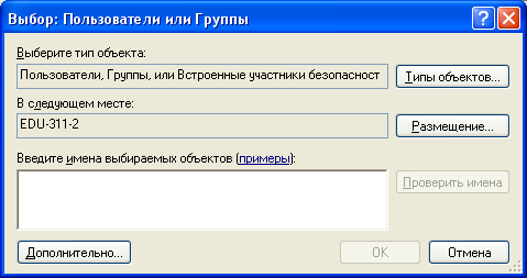 Рис. 4.30 2. В верхней части окна Группы или пользователи отображен список пользователей и групп, которым уже предоставлены разрешения для данного файла. Для добавления или удаления пользователя нужно нажать кнопку Добавить или Удалить. 3. В новом окне (рис. 4.31) ввести имя нужного объекта (пользователя), проверить это имя, нажав кнопку Проверить имена, нажать кнопку Добавить, затем ОК, чтобы вернуться на вкладку Безопасность (рис. 4.30).