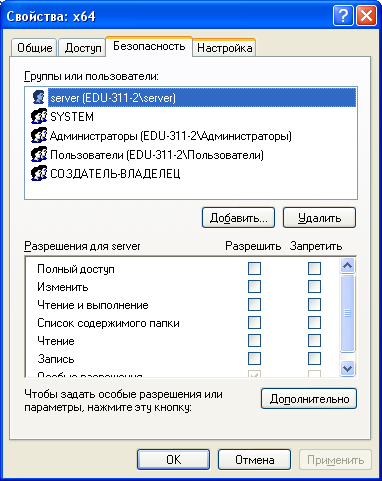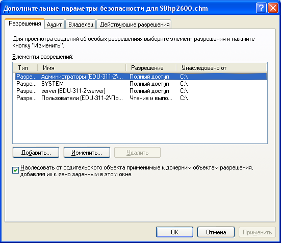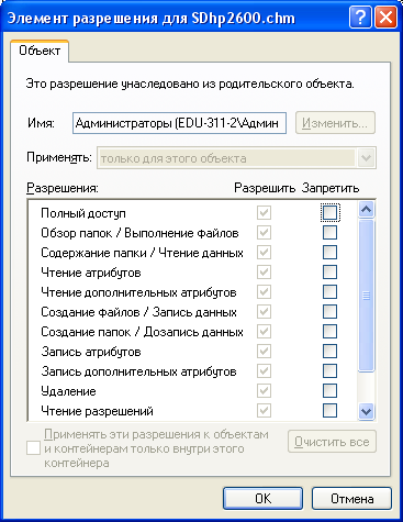 Рис. 4.31 4. Теперь можно назначить или запретить стандартные разрешения для файлов. Если нужно назначить разрешения более детально по видам возможных действий, то нужно нажать кнопку Дополнительно, после чего в новом окне (рис. 4.32) нажать кнопку Изменить и в появившемся окне выбрать нужные разрешения (рис. 4.33). Дважды нажать кнопку ОК (возвращаясь по окнам), а затем Применить и ОК.