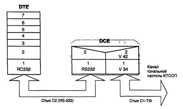 Рис. 1.6 - Профиль протоколов для модема с функциями физического и канального уровней В некоторых сетях, основанных на каналах с многоточечным подключением, сигнал, принимаемый каждым DCE, является суммой сигналов, передаваемых от целого ряда других DCE Каналы связи в таких сетях называют каналами с множественным доступом или моноканалами, а сами сети называют сетями множественного доступа. Такими сетями являются некоторые спутниковые сети, наземные пакетные радиосети, а также локальные проводные и беспроводные сети.