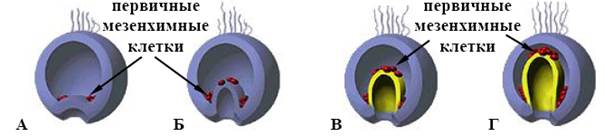Рис. 12. Поведінка мезенхімних клітин при гаструляції в морського їжака (схема): А – первинні мезенхімні клітини мігрували досередини бластоцеля; Б – вторинні мезенхімні клітини попадають досередини разом з інвагінуючою первинною кишкою; В, Г – мезенхімні клітини зберігають своє положення на вершині архентерону, а скорочення їхніх нитковидних відростків, прикріплених до внутрішньої поверхні ектодерми, сприяє інвагінації архентерону.