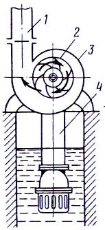Рисунок 4 - Центробежный насос. 1 - напорный патрубок; 2 - рабочее колесо; 3 - корпус; 4 - всасывающий патрубок.