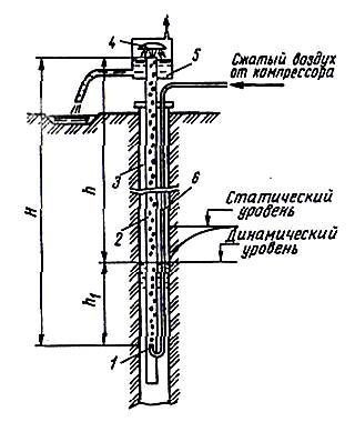 Воздушный водоподъемник (эрлифт) представляет собой опущенную в скважину 3 (рисунок 6) водоподъемную трубу 2, в которую с помощью форсунки 1 по трубе 6 подается сжатый воздух от компрессора. Образовавшаяся в трубе 2 водовоздушная смесь (эмульсия) поднимается к приемному баку 5 с водоотделителем 4, где воздух отделяется и уходит в атмосферу, а вода сливается по трубе в сборный резервуар, из которого насосами подается в сеть или водонапорную башню.