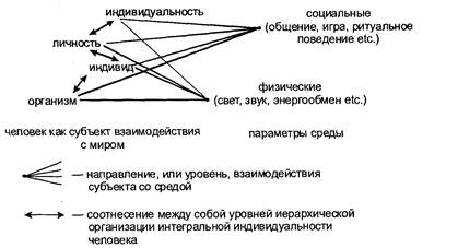 Если понятие " человек" является родовым в онтологи- ческой линии — от организма как биологической подструк- туры через индивидные свойства к личности, и далее к целостной индивидуальности, — то понятие " субъект" оказывается исходным для характеристики процесса " субъект—объектного" взаимодействия, идет ли речь о био- логической (психофизиологической), собственно психи- ческой или социальной активности человека. Для полноты картины будет уместно представить сказанное в виде сле- дующего рисунка 4.