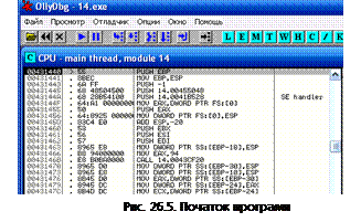 Щоб програма приймала будь-який ключ треба змінити її код у налагоджувачі. Відкриваємо ехе-файл у налагоджувачі OllyDbg (рис. 26.4).