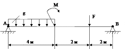 Задача № 2. Для балки (рис. а) определить реакции опор в точках А и В, если F = 16 кН, g = 2кН/м и М = 12 кН·м.